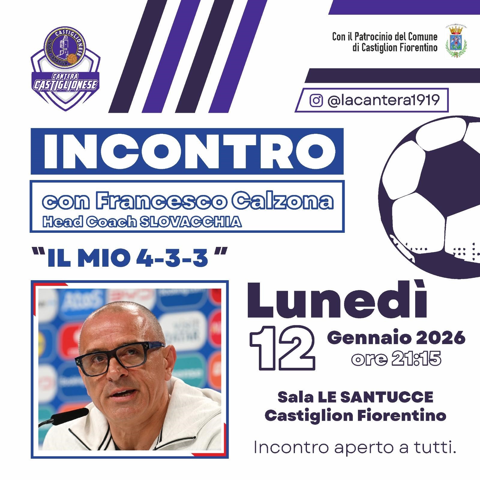 La sera, ore 21.15, è previsto l’incontro con Francesco Calzona, il “head coach” (o capo allenatore) della Slovacchia che illustrerà tra aneddoti e strategie calcistiche il suo modulo tattico prediletto, il 4-3-3, ispirato a Sarri e Spalletti.  L’evento è organizzato dalla U.S. Castiglionese con il patrocinio del Comune di Castiglion Fiorentino.