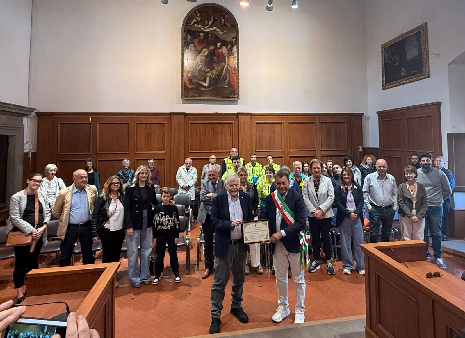 Così Aubrey Marshall Daniel III alla cerimonia di conferimento della Cittadinanza Onoraria tenutasi questa mattina in Sala San Michele alla presenza di tanti amici, tra cui anche una nutrita rappresentanza della Confraternita di Misericordia capitanata dalla Governatrice, Paola Salvadori.