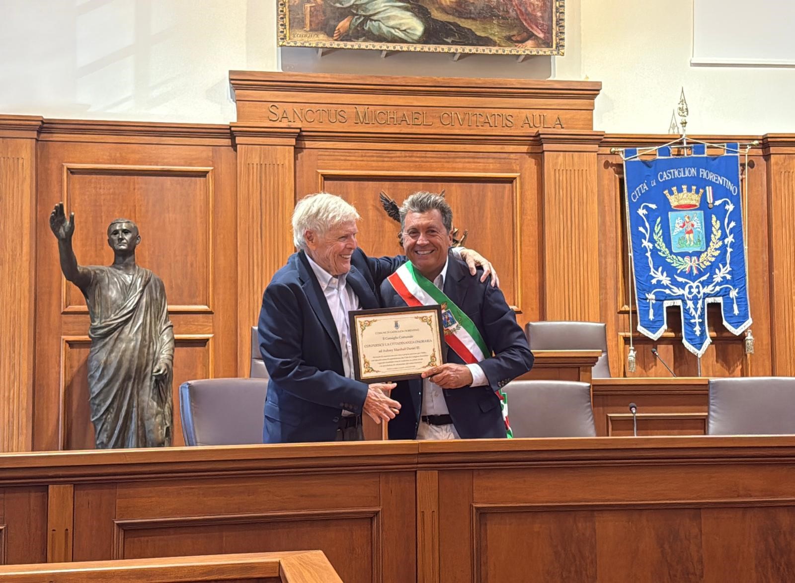 “Aubrey, perché così lo chiamiamo tutti” – ha detto il sindaco Mario Agnelli che ha aggiunto – “ha conquistato questa cittadinanza onoraria per meriti e in maniera unanime da parte del Consiglio Comunale. Ma quello che si evince da questa mattina, l’ha conquistata da tutti i cittadini. Un uomo arrivato in punta di piedi, che ha deciso di acquistare una casa in Val di Chio e l’ha costruita con amore, sapendo riconoscere in questo territorio casa sua. I cittadini gliene danno merito, e non è dipeso solo dai tanti atti di generosità che lui ha fatto per Castiglion Fiorentino. Lo considero un modello di persona che vuole vivere in questo territorio, calandosi nella parte del cittadino benemerito e con l’amore di chi conosce e sa riconoscere la qualità della vita a Castiglion Fiorentino e in Val di Chio”.